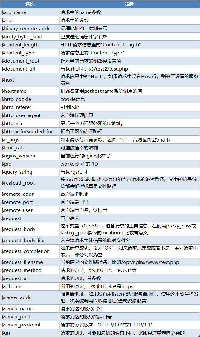 Nginx内置绑定变量 发布于2018年7月9日 作者:ghost Nginx 作为一个成熟、久经考验的负载均衡软件,与其提供丰富、完整的内置变量是分不开 的,它极大增加了对 Nginx 网络行为的控制细度。这些变量大部分都是在请求进入时解析 的,并把他们缓存到请求 cycle 中,方便下一次获取使用。首先来看看 Nginx 对都开放了那 些 API 。 参看下表: 其实这还不是全部,Nginx 在不停迭代更新是一个原因,还有一个是有些变量太冷门,借助它们,会有很多玩法。